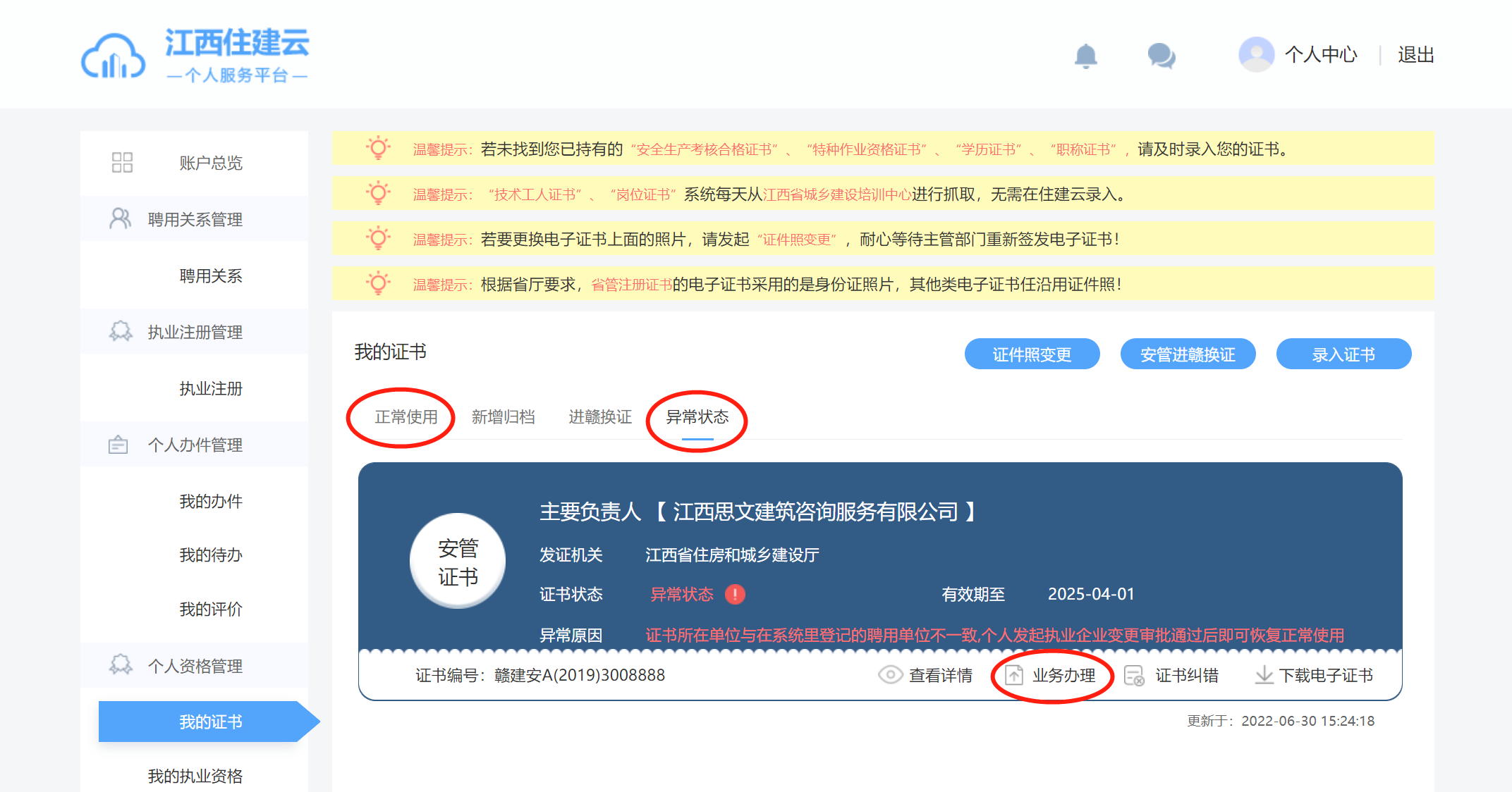在電腦端登錄“江西住建云個人服務平臺”,【我的證書】→【異常狀態】→【業務辦理】→【注銷】