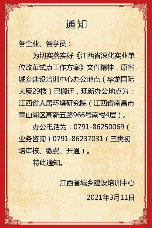 為切實落實好《江西省深化實業(yè)單位改革試點工作方案》文件精神,原省城鄉(xiāng)建設(shè)培訓(xùn)中心辦公地點(華龍國際大廈29樓)已搬遷,現(xiàn)新辦公地點為:江西省人居環(huán)境研究院(江西省南昌市青山湖區(qū)高新五路966號南樓4層)。